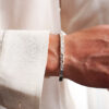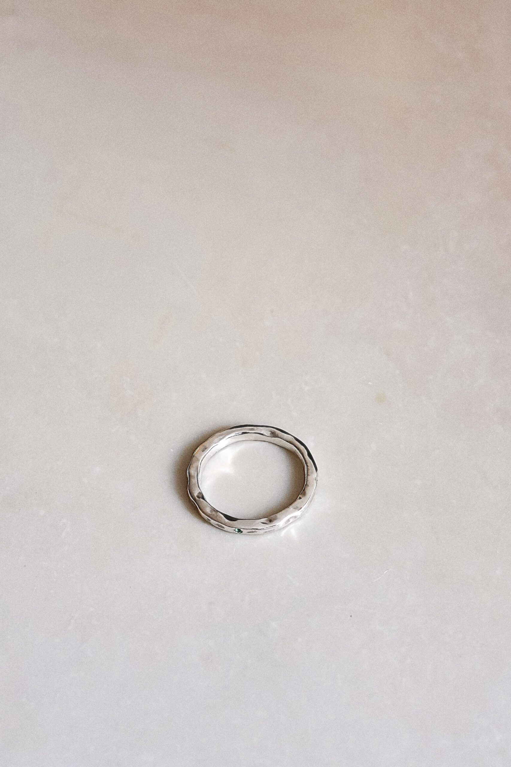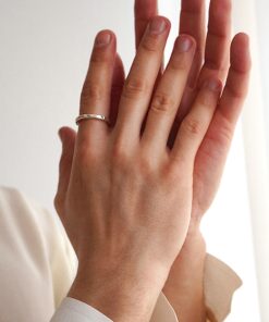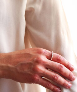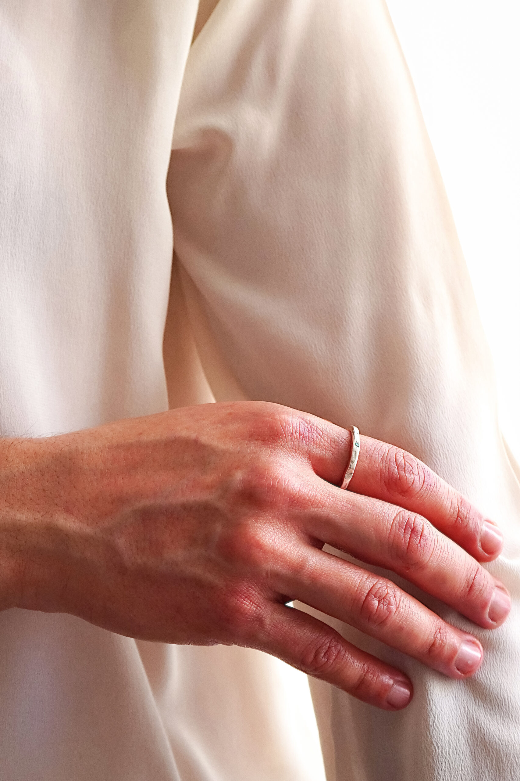 O anel Lunatrina traduz em prata 950 a delicadeza da lua crescente e o mistério do número três. Suas esmeraldas, em cravação triangular, evocam constelações que iluminam o céu noturno, transformando equilíbrio e espiritualidade em joia.