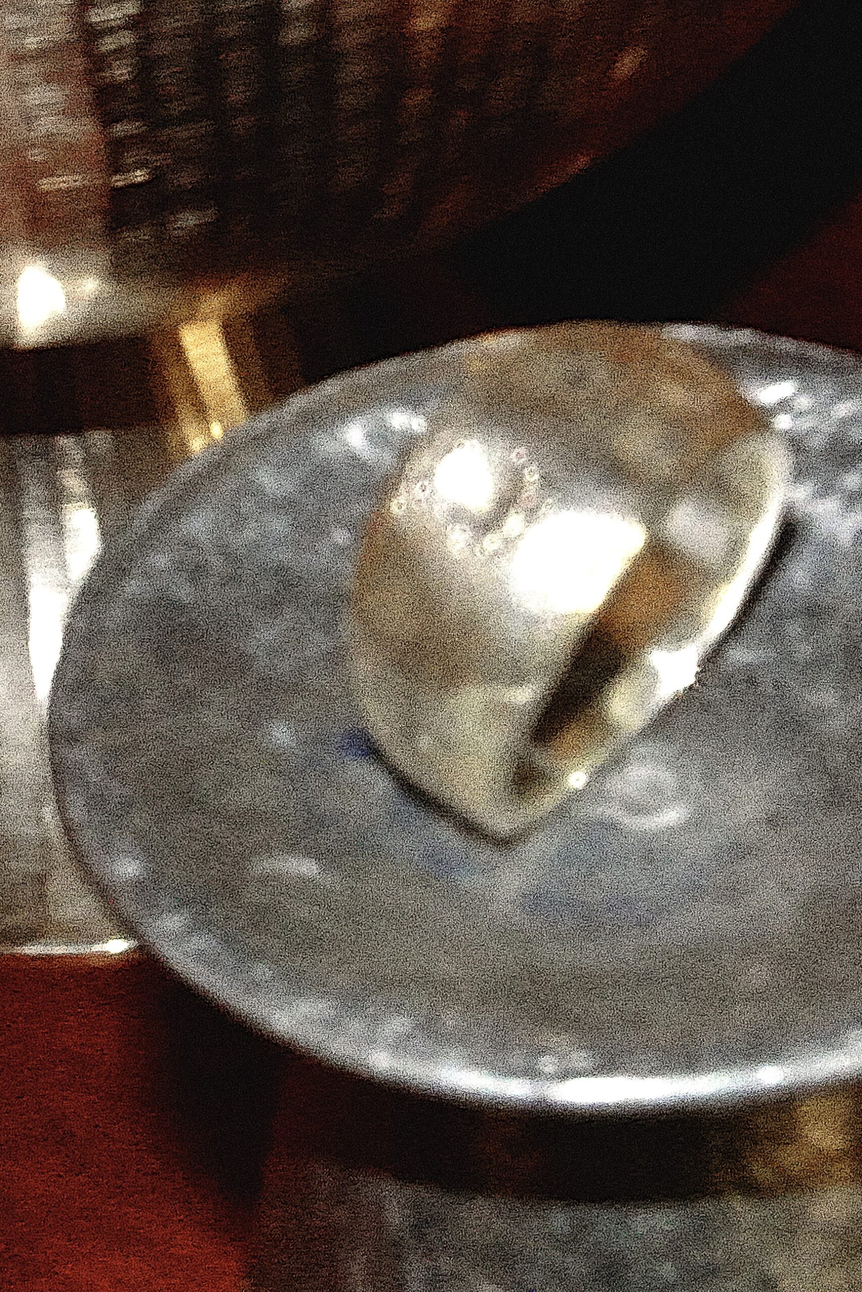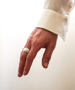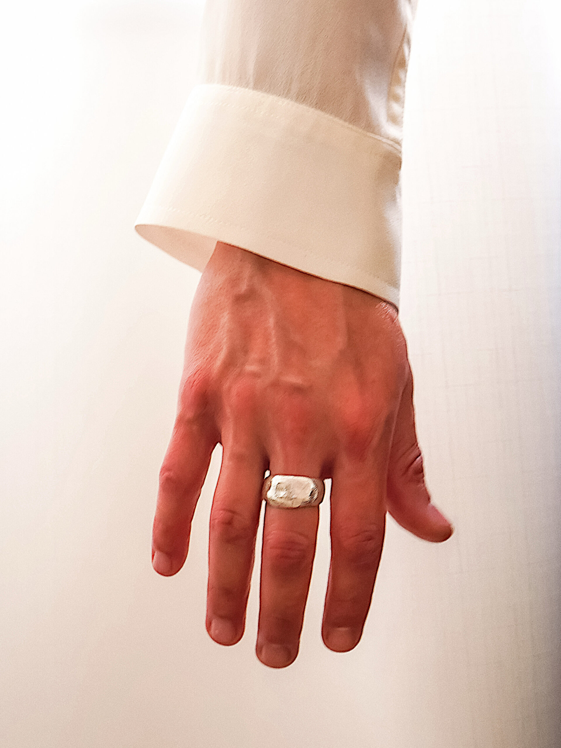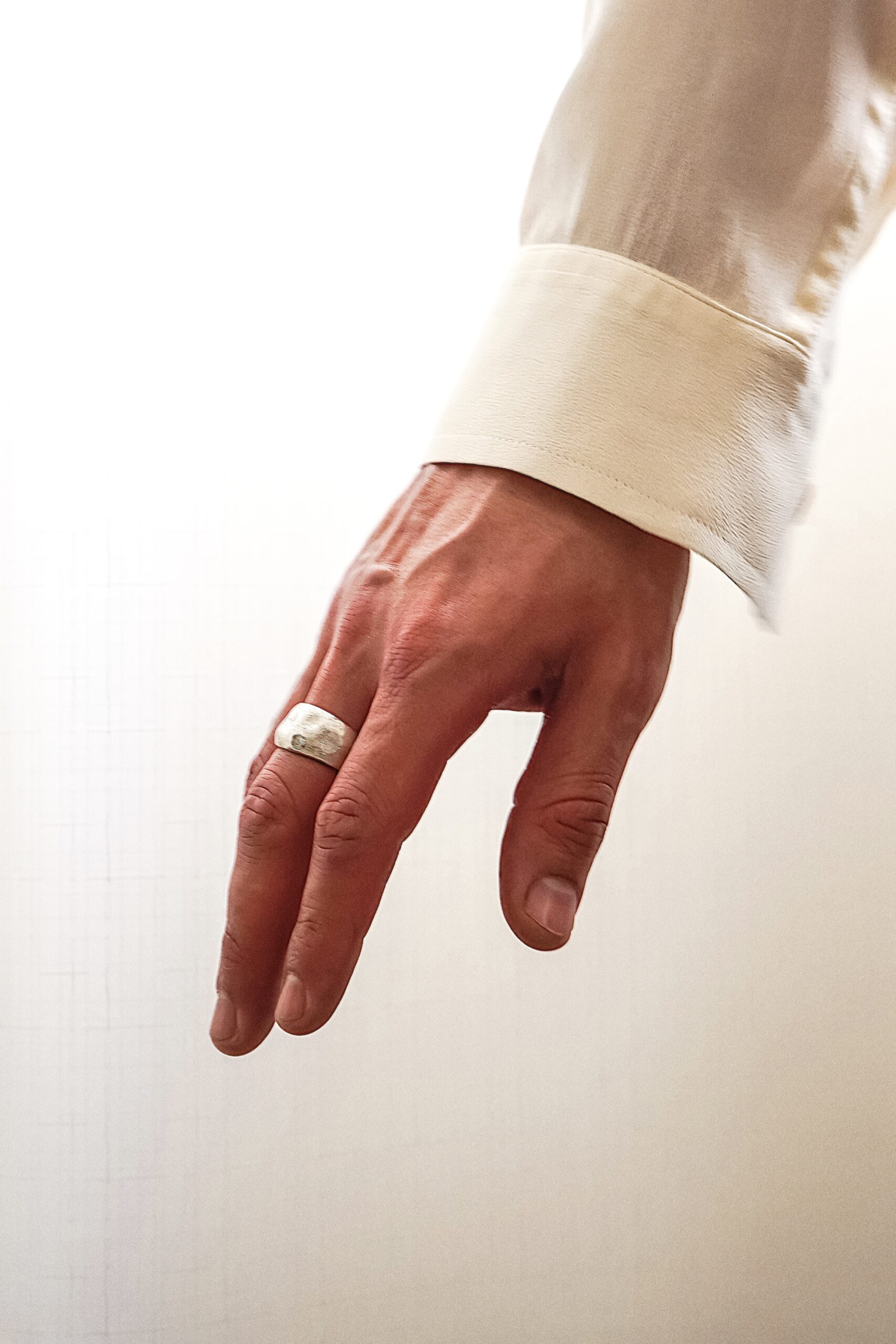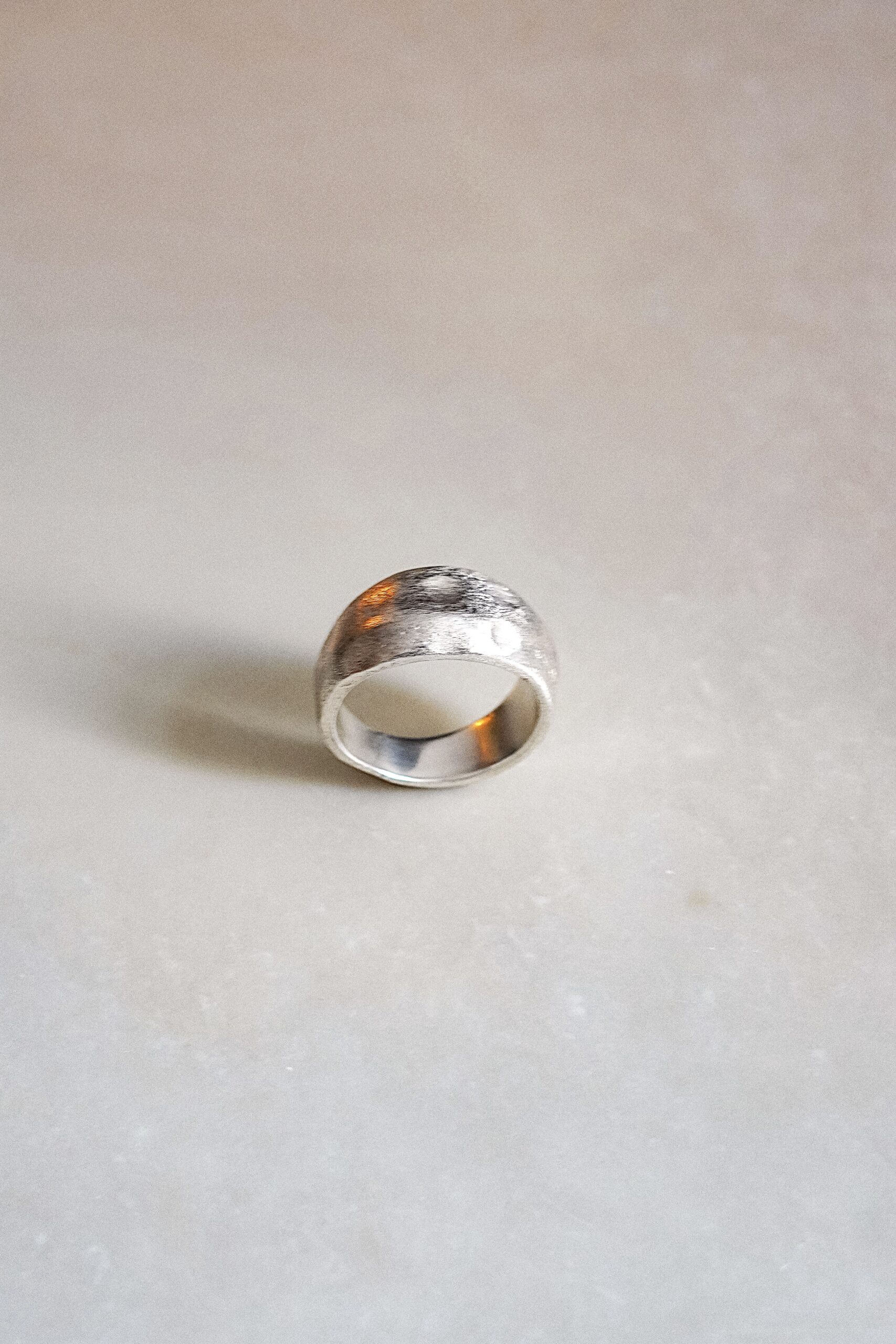 O anel LunaPiena captura em prata 950 a plenitude da lua cheia. Sua superfície martelada evoca as crateras iluminadas no auge do ciclo lunar, transformando o brilho da noite em eternidade.